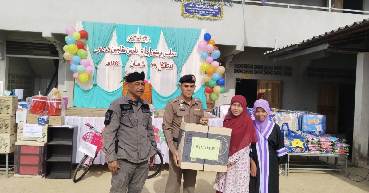 พ.ต.ท.สำราญ มากจันทร์ สวญ.สภ.ปะแตมอบของรางวัลให้แก่เด็กนักเรียนศูนย์การศึกษาศาสนาและจริยธรรมประจำมัสยิดตาดีกานุ