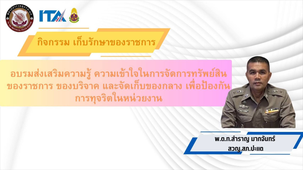 กิจกรรมที่ 6 วันที่ 10 เมษายน 2568 เวลา 11.30 น. พ.ต.ท.สำราญ มากจันทร์ สวญ.สภ.ปะแต พร้อมข้าราชการตำรวจสถานีตำรวจภูธรปะแต ทุกแผนกงาน อบรมกำชับให้ความรู้กิจกรรม การรักษาสิ่งของหลวงทุกชนิดที่เบิกยืมไป ให้ดูแลความสะอาดเรียบร้อย ทำความสะอาด รักษาให้ดี ห้ามนำไปจำนำ หรือให้ผู้อื่นยืมโดยเด็ดขาด